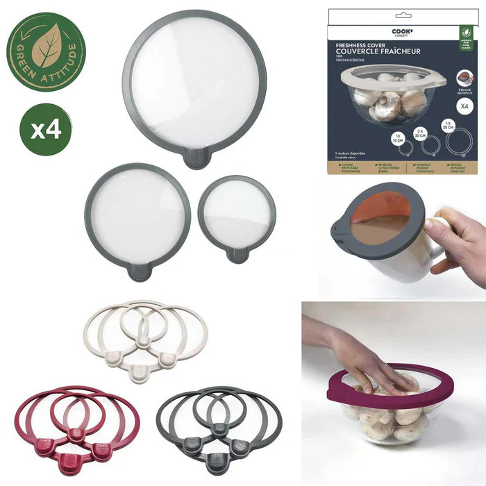 The Couvercle Fraicheur X4 M18 set includes four airtight lids designed to preserve food freshness and prevent spills. Engineered for a secure fit on compatible containers, these lids help extend the shelf life of stored ingredients and reduce waste. Their durable construction supports everyday use in professional and home kitchens, ensuring reliable sealing and easy handling.