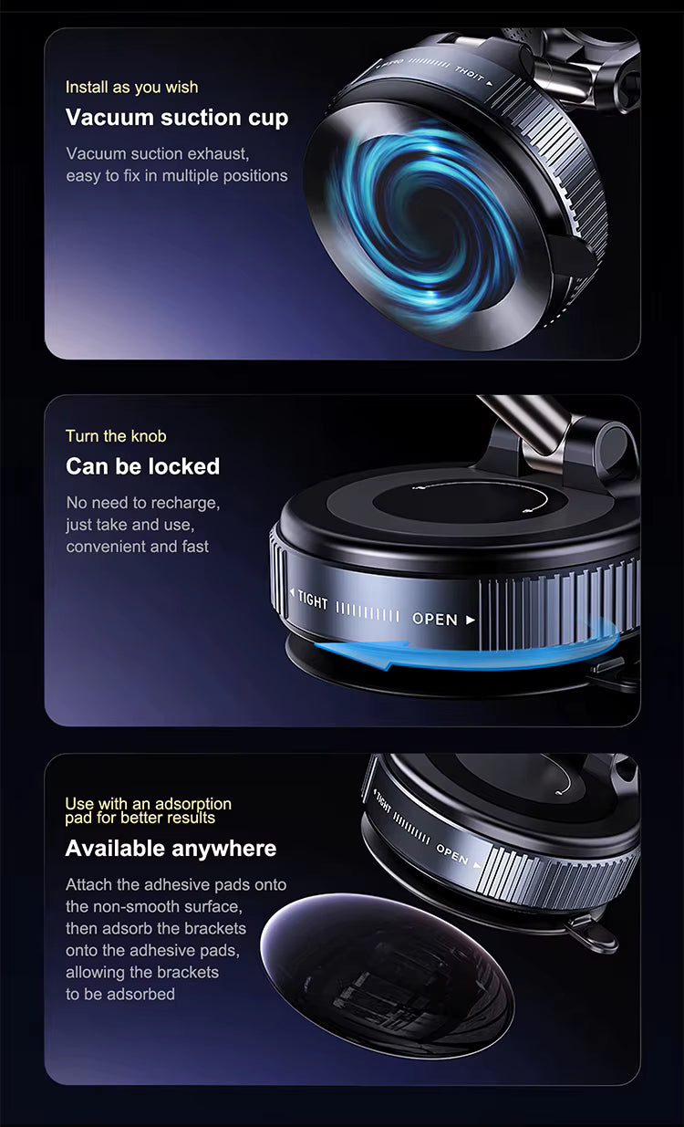 Choose from dashboard, air vent, or wall mounting to suit your needs. Includes adhesive base and air vent clip for versatile use.